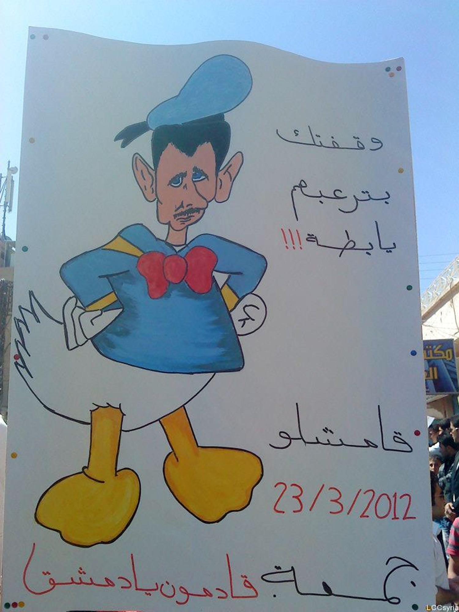 Sites e páginas do Facebook da oposição estão cheias de piadas com o presidente sírio. Uma fotomontagem mostra apoiadores do regime de joelhos, beijando a imagem de um pato.